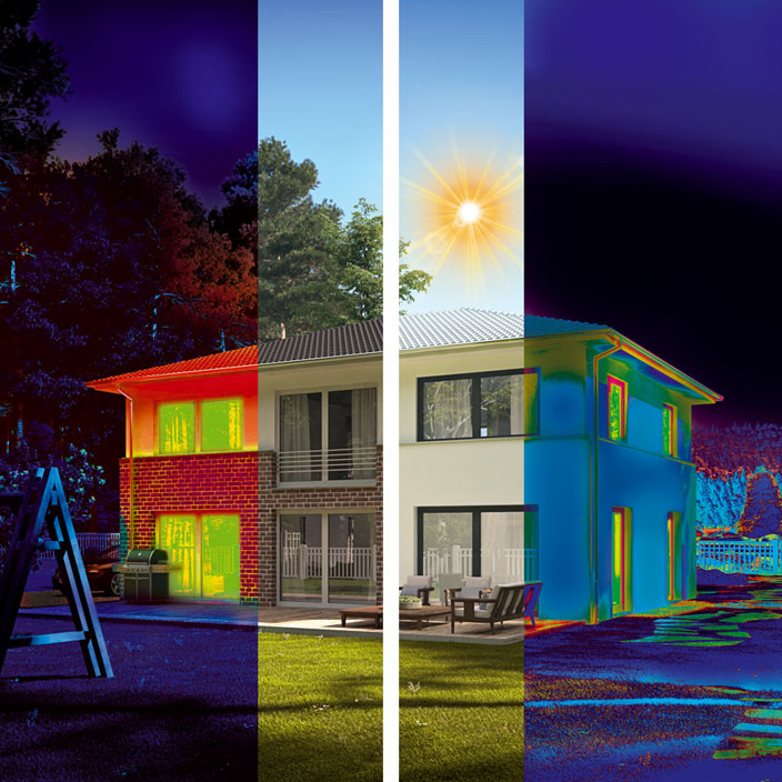 L’énergie thermique de la surface d’un mur ainsi réchauffé pénètre en profondeur et traverse avec le temps vers l’intérieur du bâtiment. Pour diminuer la température à l’intérieur, il faut utiliser un climatiseur, ce qui implique une demande d’énergie électrique. Plus la résistance thermique d’un tel mur est faible, plus le climatiseur a besoin d’énergie pour refroidir la pièce. Il faut également noter qu’un mur constamment réchauffé par le soleil à hautes températures commence à se comporter comme un accumulateur : il collecte et stocke l’énergie thermique qui, même le soir, quand il fait déjà frais dehors, continue à dégager de la chaleur et réchauffe l’intérieur. Ainsi le climatiseur fonctionne non seulement le jour au plus haut niveau d’efficacité et consomme par là de grandes quantités d’énergie, mais également le soir et la nuit.