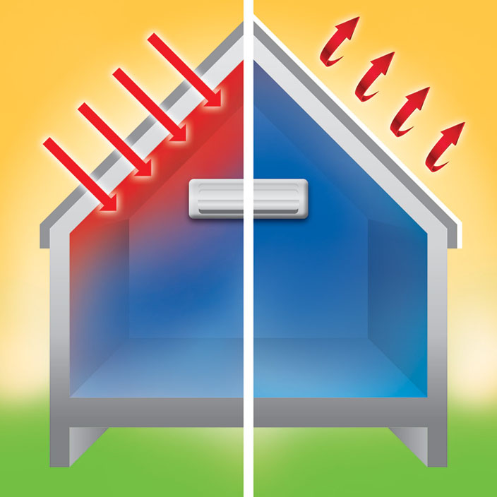 L’énergie thermique ainsi accumulée de la surface réchauffée pénètre en profondeur dans la cloison qu’est le toit, pour traverser avec le temps vers l’intérieur du bâtiment. L’abaissement de la température intérieure trop élevée ainsi créée force l’utilisation d’un climatiseur, ce qui implique une consommation d’énergie électrique. Plus la résistance thermique de la cloison de toiture est faible, plus le climatiseur a besoin d’énergie pour refroidir la pièce.